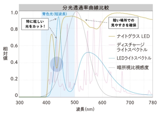 車のライト(LED、ディスチャージライトを含む)の光の中でも、青色光線と呼ばれる波長を特定的に抑える仕組みです。