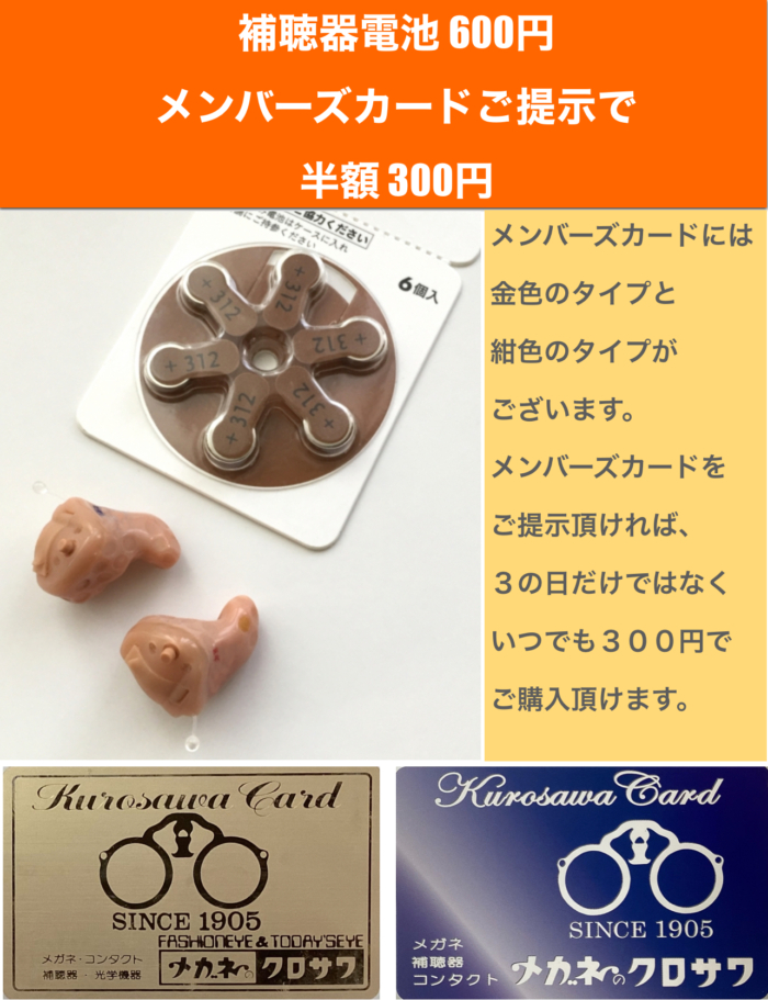 また、今回の補聴器相談会の日以外でも、クロサワのメンバーズカードをご提示いただければいつでも半額の300円で補聴器の電池をご購入頂けます。