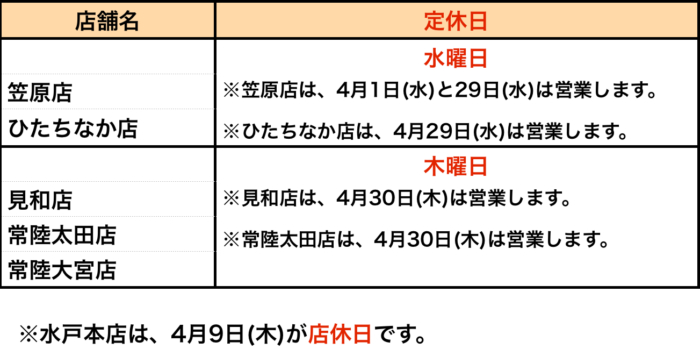 4月の定休日をお知らせいたします。各店の営業日をご確認ください。