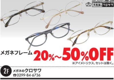 期間中、クロサワではメガネフレームが20%~50%OFFセールをおこなっています!!(一部除く)